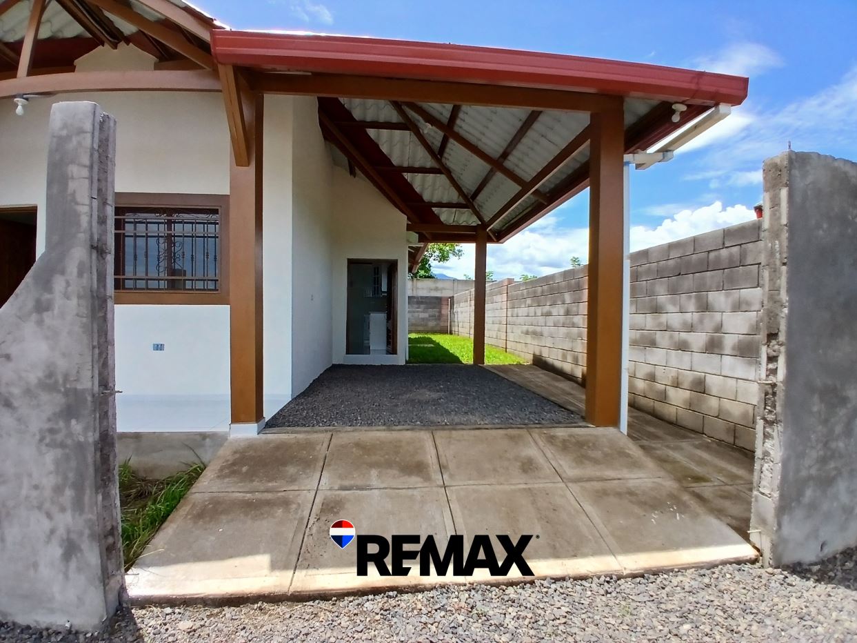 Cochera para un vehículo y un jardín engramado que rodea la casa.
