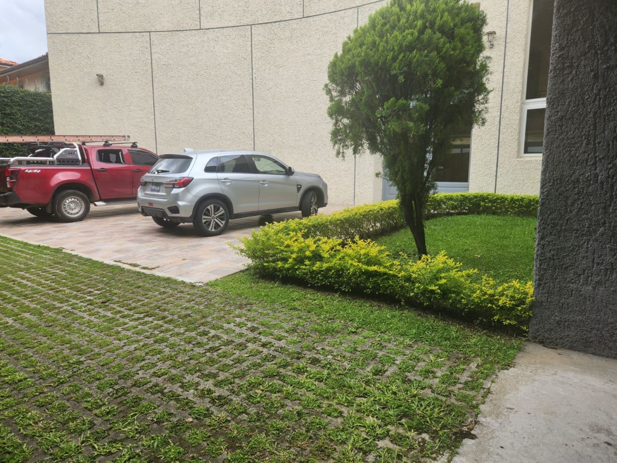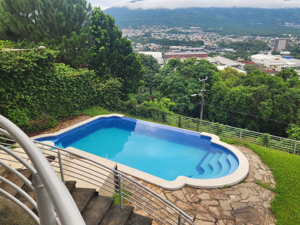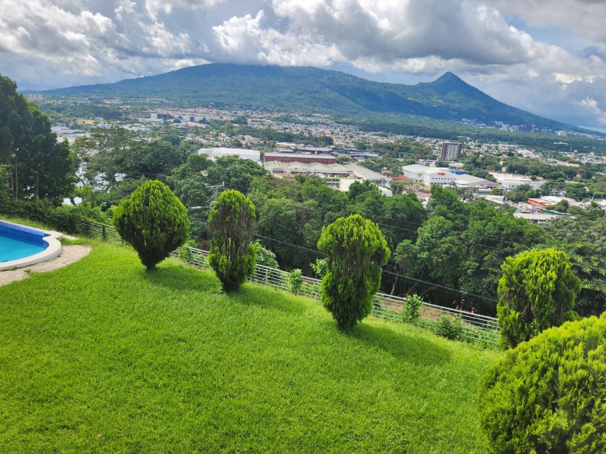 Descripción de los 3 niveles:Nivel MedioPortón eléctrico, cochera techada para 3 vehículos + espacio para 10 adicionalesLobby de accesoSala principal y comedor con terraza panorámicaEstudio, baño social y sala de música/juegosCocina principal para propietarios con desayunadorÁrea de servicio: segunda cocina con muebles Olins, comedor, lavandería, dormitorios y baño para empleadosNivel Superior2 habitaciones máster con baño privado y walk-in closet2 habitaciones junior con baño cada unaSala familiar con terrazaNivel Inferior2 habitaciones con baño que pueden servir para huéspedes o gimnasioSala familiarPiscina rodeada de jardín con vista a la ciudad y al volcánCaracterísticas adicionales:Las puertas de la casa son de madera con diseño en forma de diamanteCalentador de aguaEspacio para instalación de ascensorUbicación: Residencial Sierra Santa Elena, San Salvador. Zona con seguridad 24/7, rodeada de naturaleza y con excelente conectividad.Precio: $2,300,000Contáctame para más información o agendar una visita.
