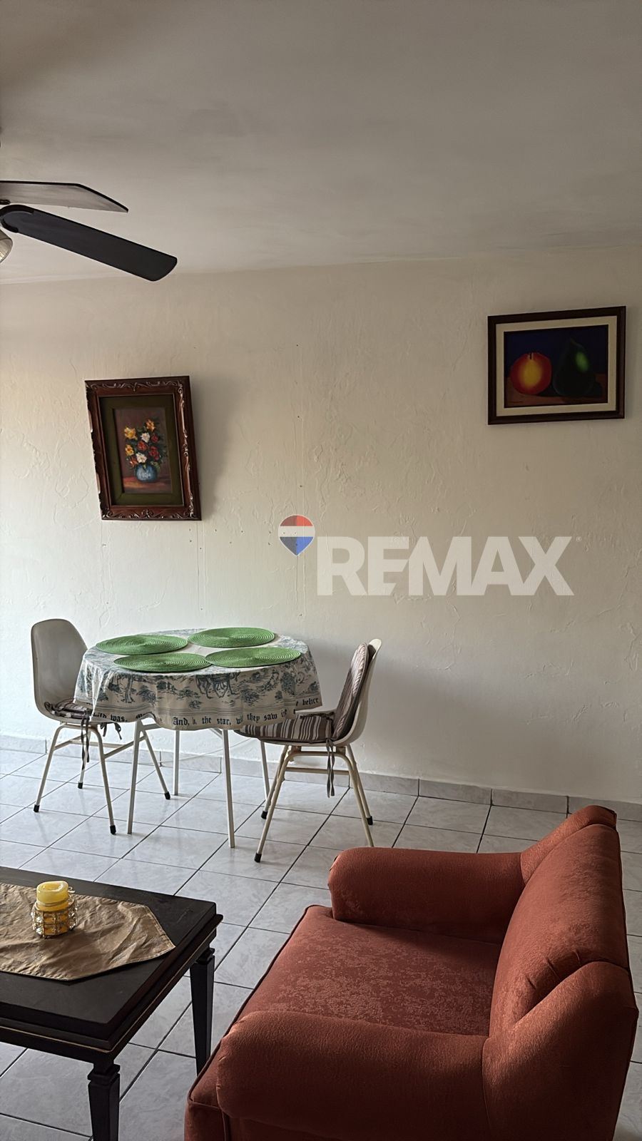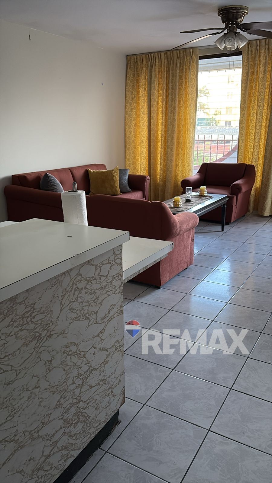 Concepto abierto de Sala, Comedor y Cocina con ventilador de cielo.
